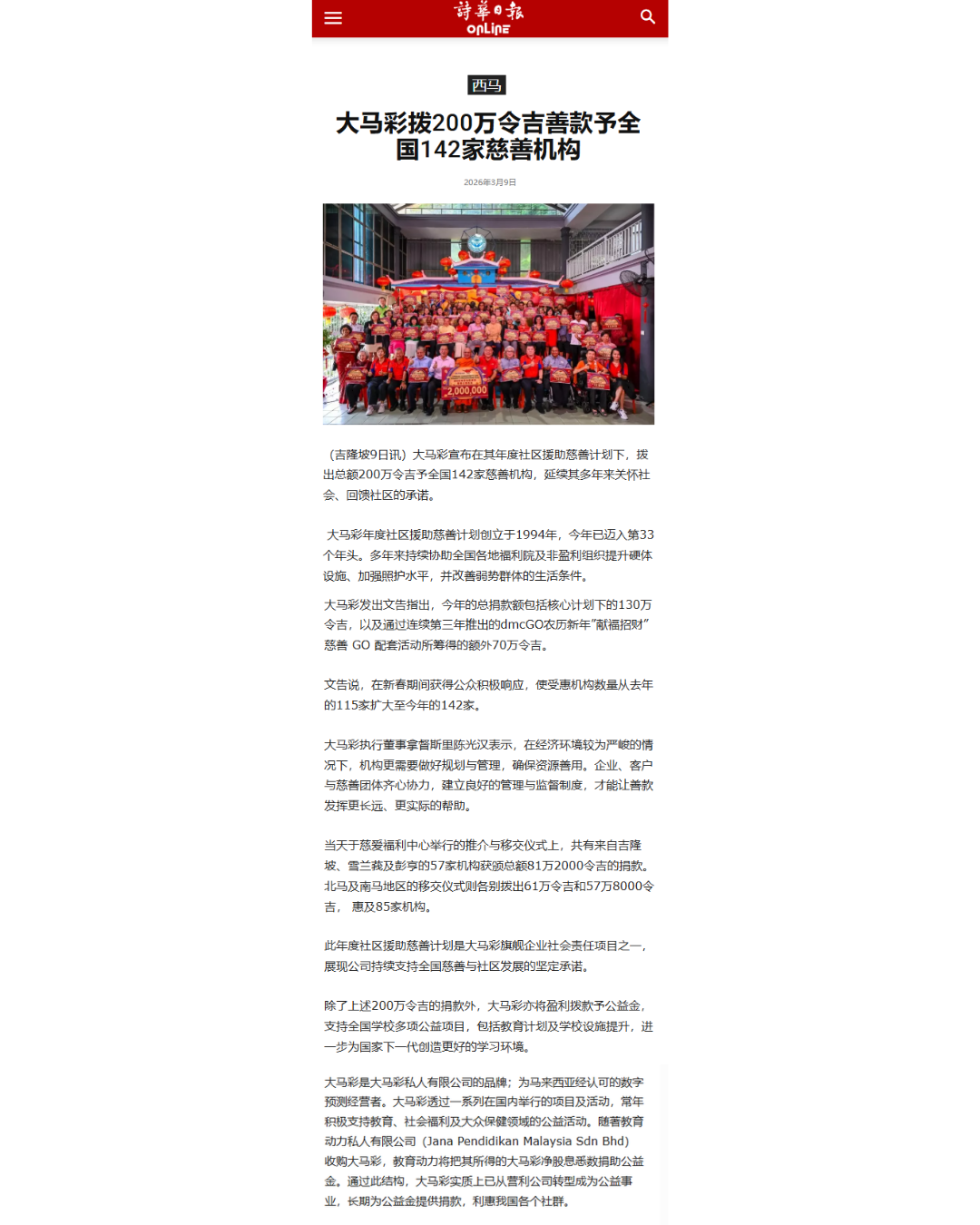 The Annual Community Aid Charity Programme remains one of Da Ma Cai’s flagship corporate social responsibility initiatives, reflecting its continued commitment to supporting charitable and community development effort nationwide.