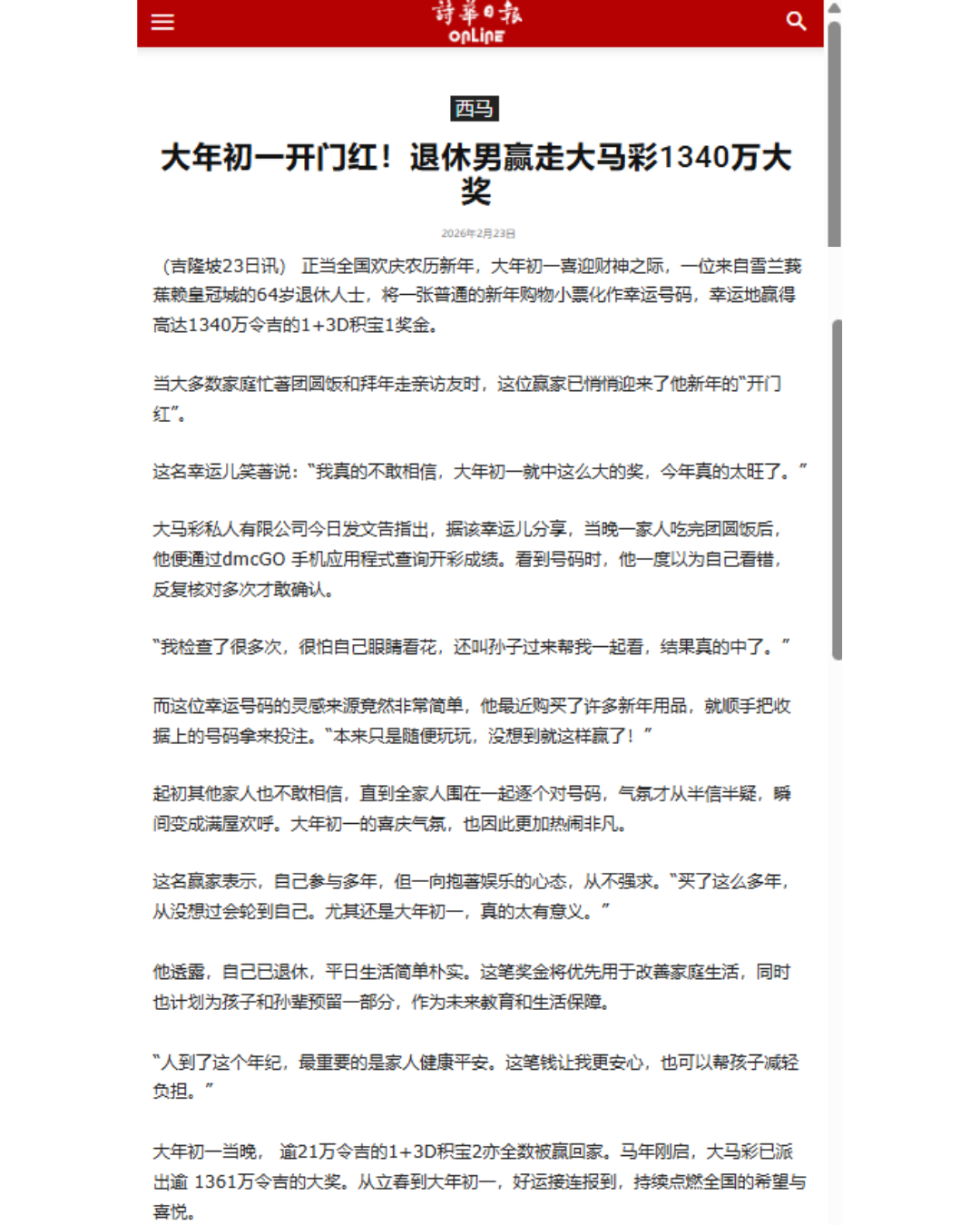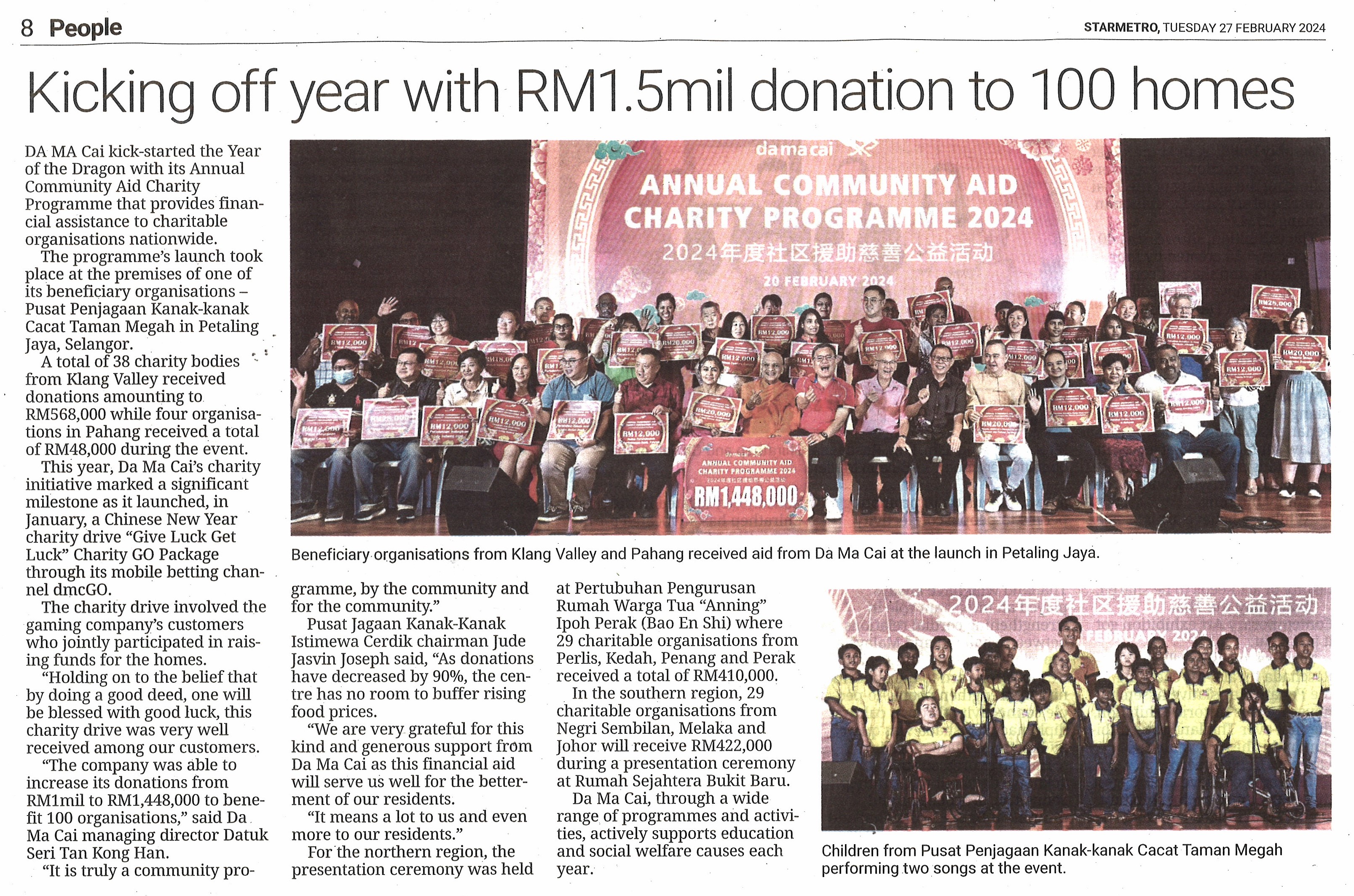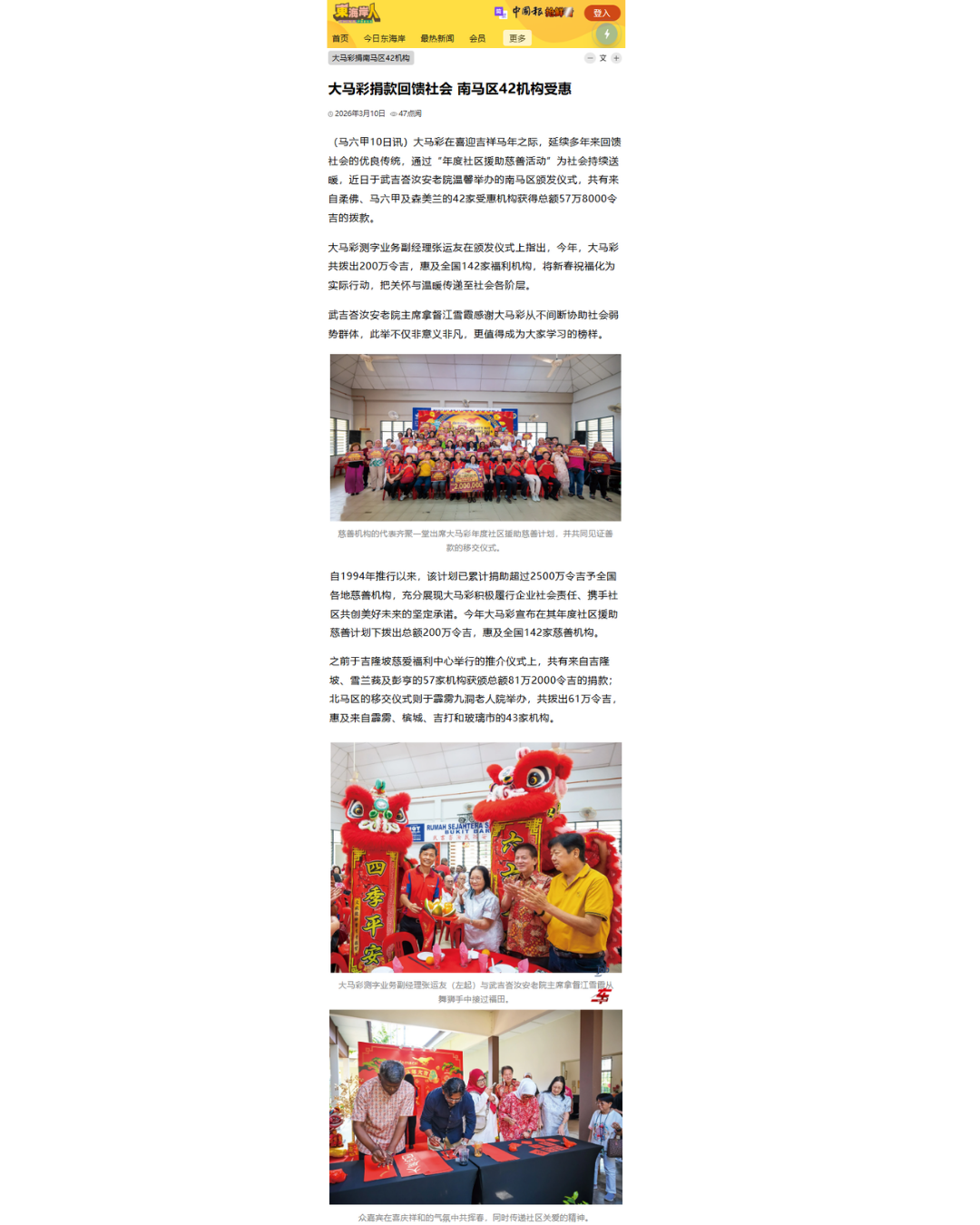 Da Ma Cai is featured in major dailies over a wide range of activities especially in the areas of education and social welfare, as well as news featuring our promotional campaigns and contests for loyal customers, and winning stories on our lucky Jackpot winners are also featured here.