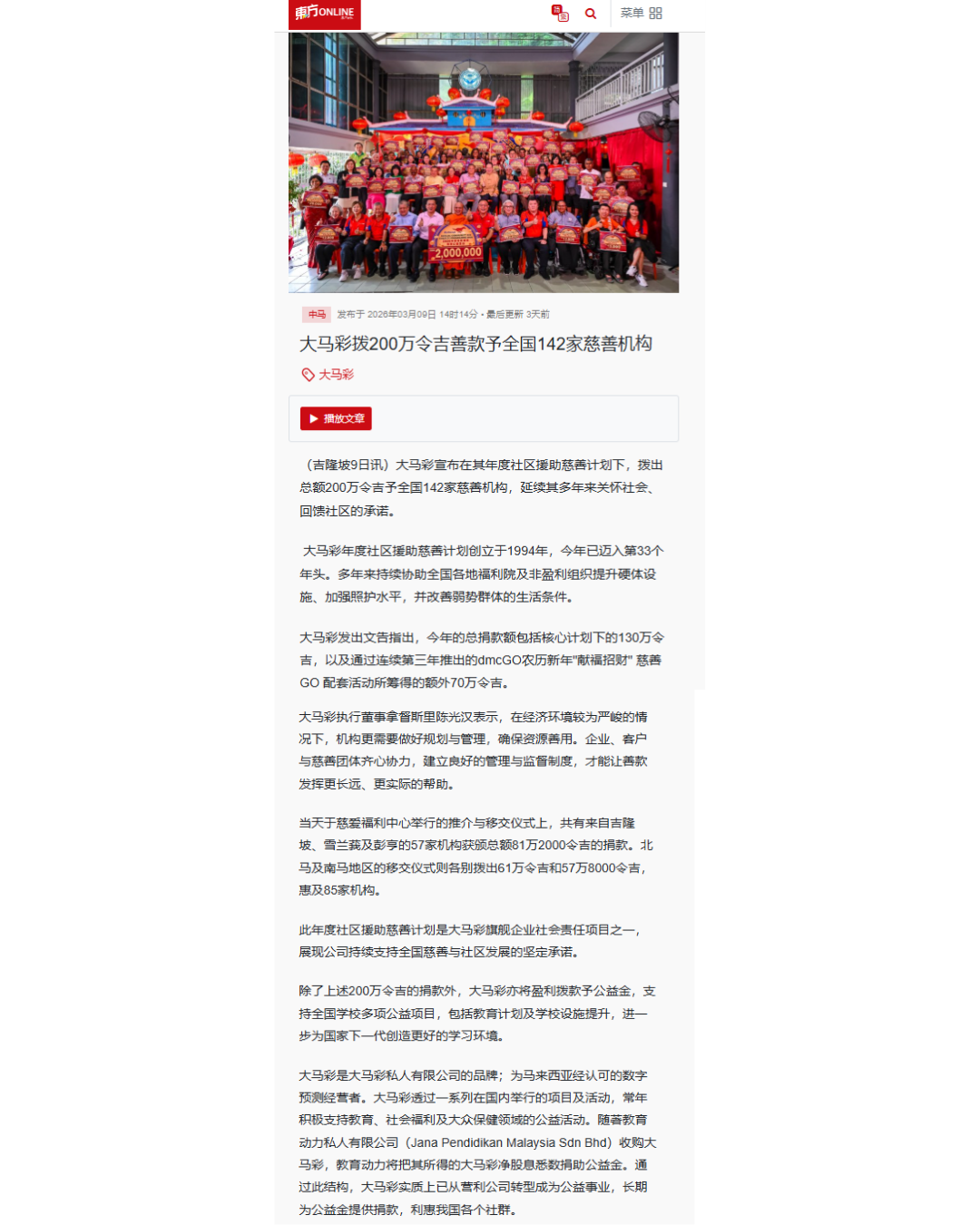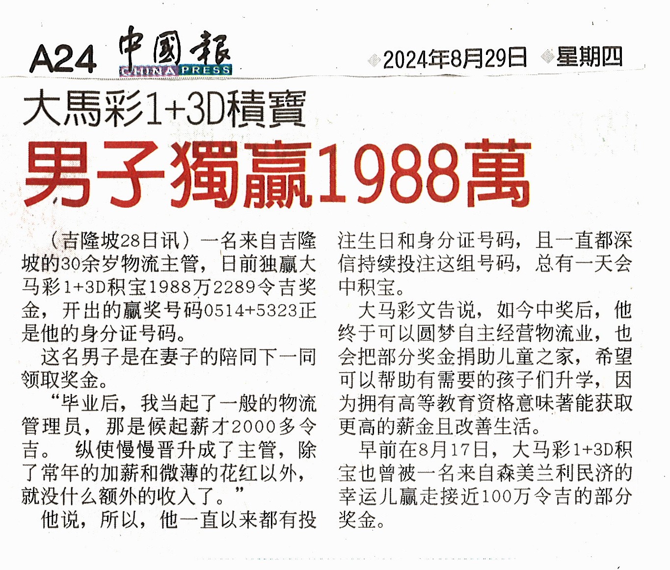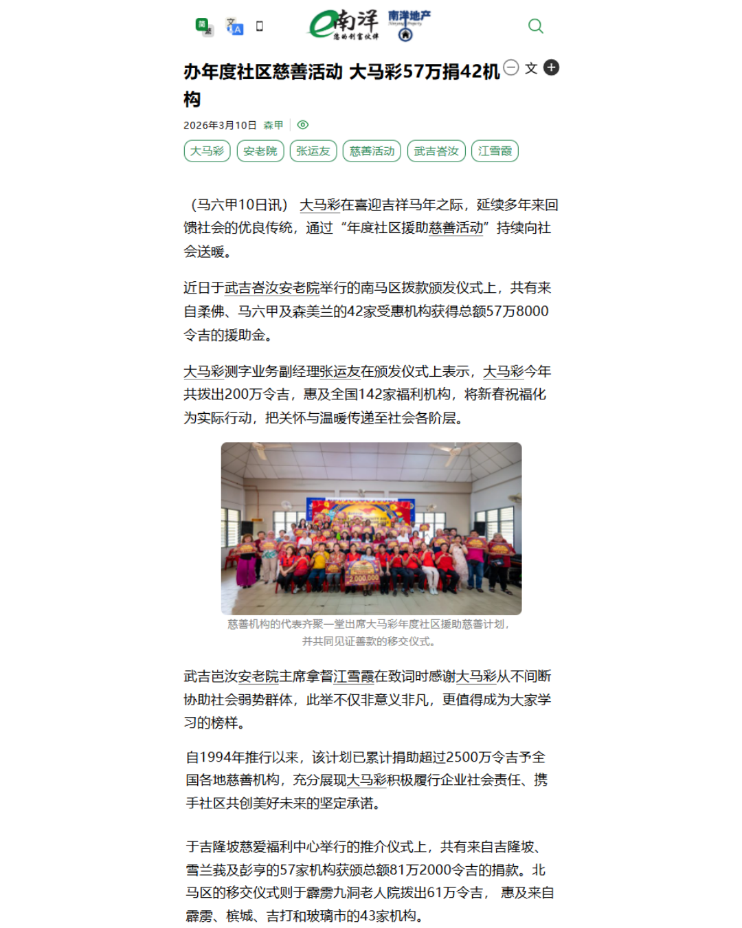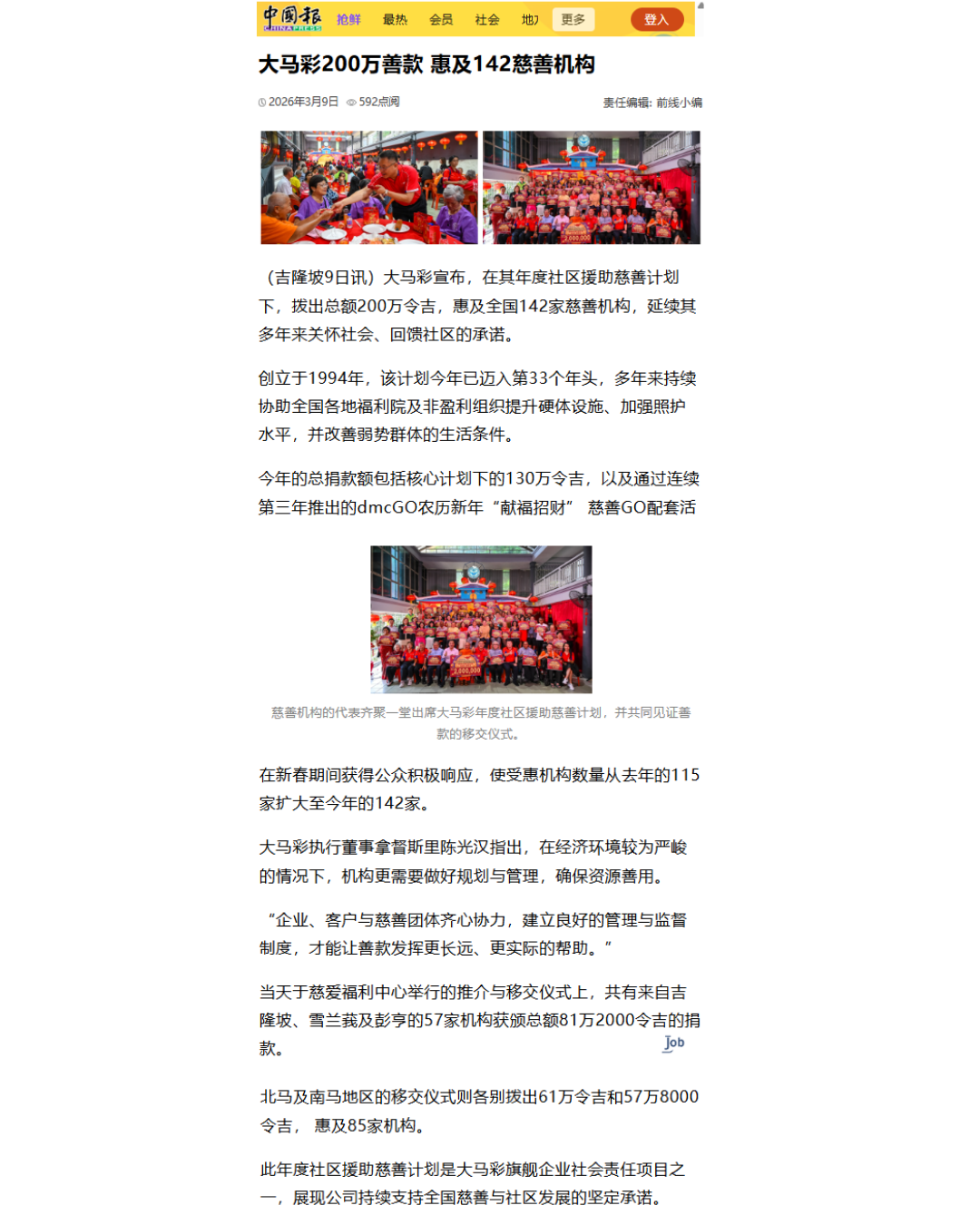 Da Ma Cai is featured in major dailies over a wide range of activities especially in the areas of education and social welfare, as well as news featuring our promotional campaigns and contests for loyal customers, and winning stories on our lucky Jackpot winners are also featured here.